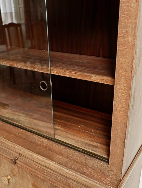 Horní část tvoří prostorná knihovna s posuvnými skleněnými dvířky, které umožňují pohodlný přístup a zároveň chrání uložené předměty. Police jsou výškově nastavitelné. Ve střední části se nachází praktické výsuvné police, vhodné například pro práci nebo vystavení předmětů.