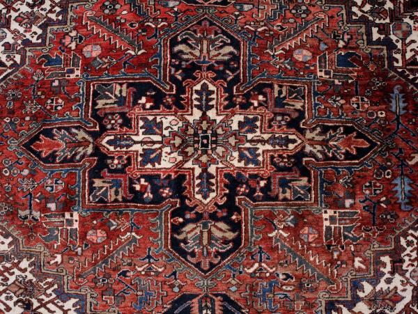 Ručně vázaný perský koberec Heriz z Íránu, vyrobený z kvalitní vlny na pevné bavlněné osnově. Tento typ koberců patří mezi nejcharakterističtější a nejodolnější perské produkce, ceněné pro svou výraznou kresbu a dlouhou životnost.