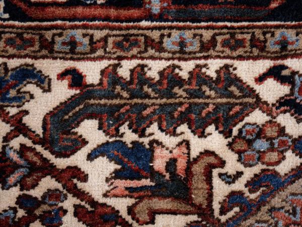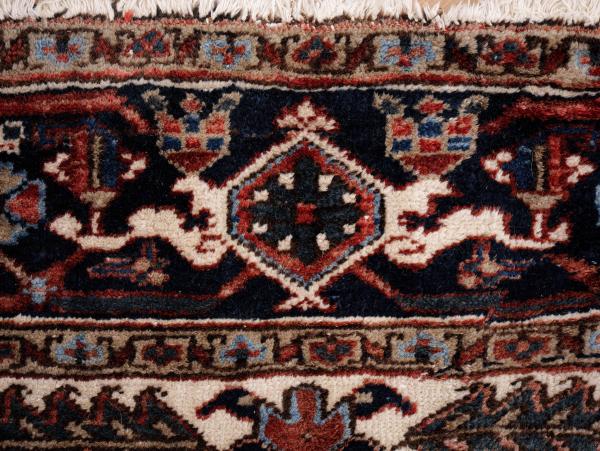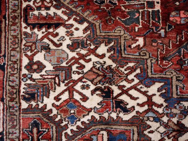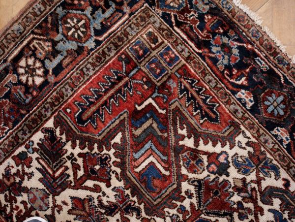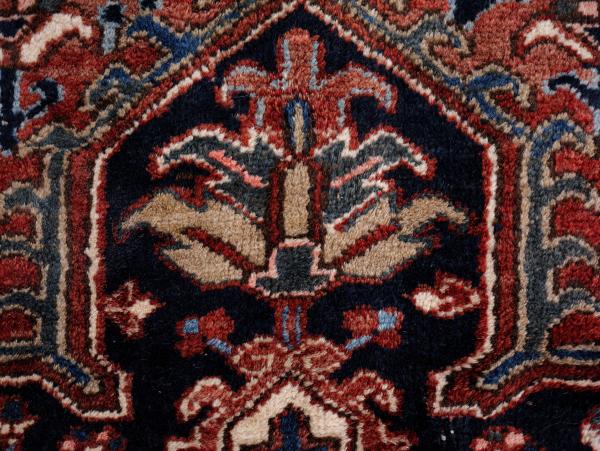 Kompozice je založena na typickém centrálním medailonu s geometrizovanými rostlinnými motivy, které jsou pro oblast Heriz typické. Ornamentika je výrazná, pevně strukturovaná a působí velmi dekorativně i z větší vzdálenosti.