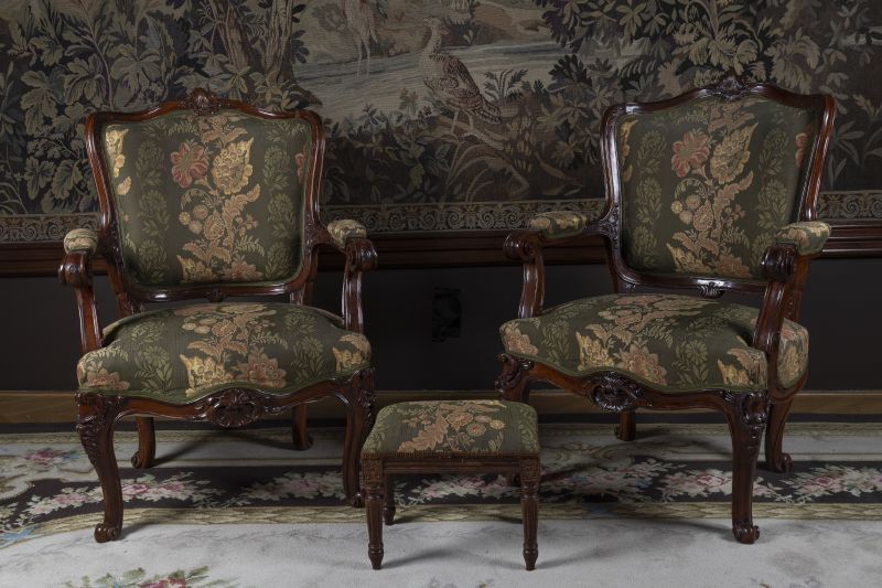 2. pol. 20. století, dřevo ořechové, řezané, tmavě mořené, čalouněno zeleným brokátem s výrazným s motivem květů, přiložena podnožka
