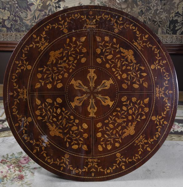 20. století, Holandsko, dřevo, mahagonová dýha, bohatě interzované motivy rozvilin s ptáčky a lyrami světlou dýhou v holandském stylu, centrální trojboká noha