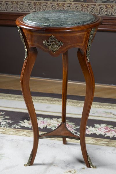 novodobé, dřevo, dýhováno exotickými dřevy, bronzové apliky, kruhový tvar s vloženou deskou ze zeleného mramoru, tři esovité nohy spojené trnoží