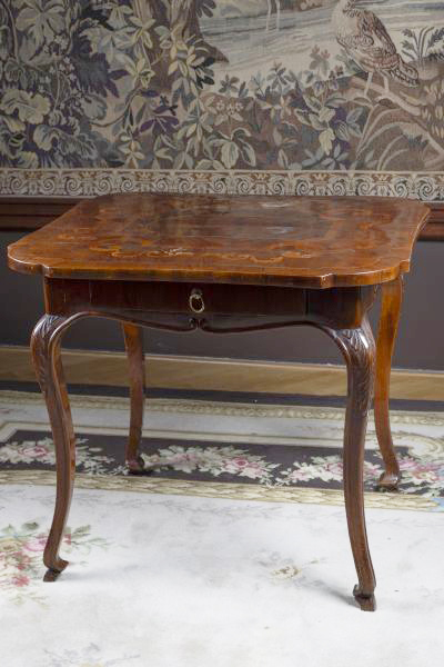 19. století, střední Evropa, dřevo, ořechová dýha, čtyři řezané esovité nohy, intarzovaná deska s motivy pásky a rozvilin, restaurováno