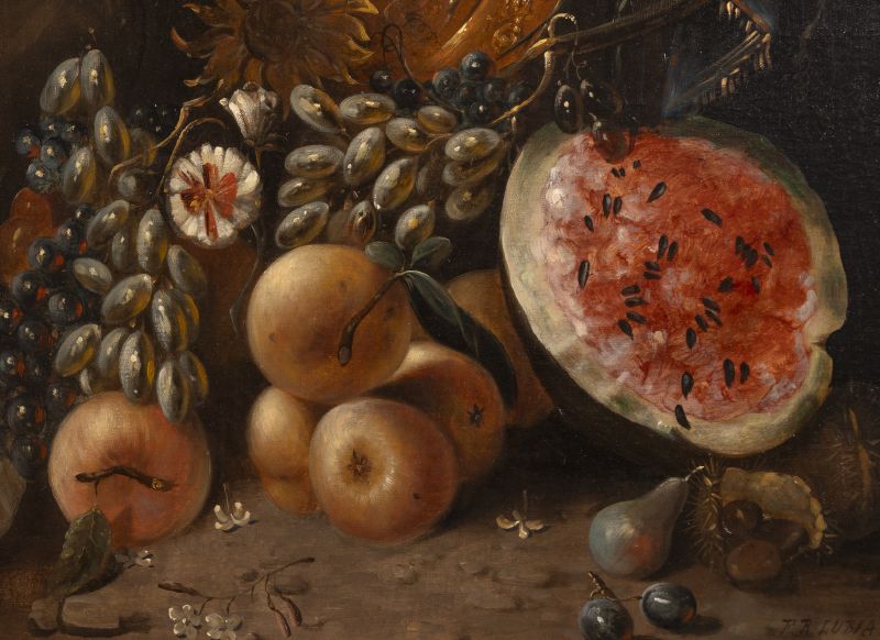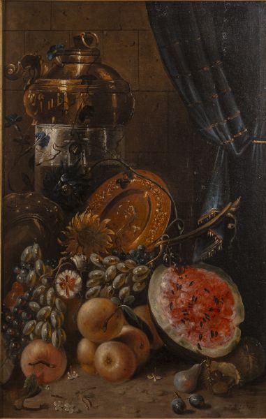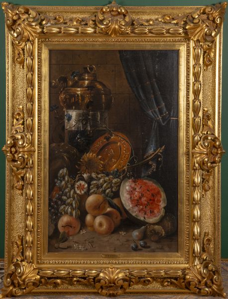 Zátiší se stříbrem a ovocem, konec 19. století, olej/plátno, signováno vpravo dole F. R. Lubia, dekorativní rám