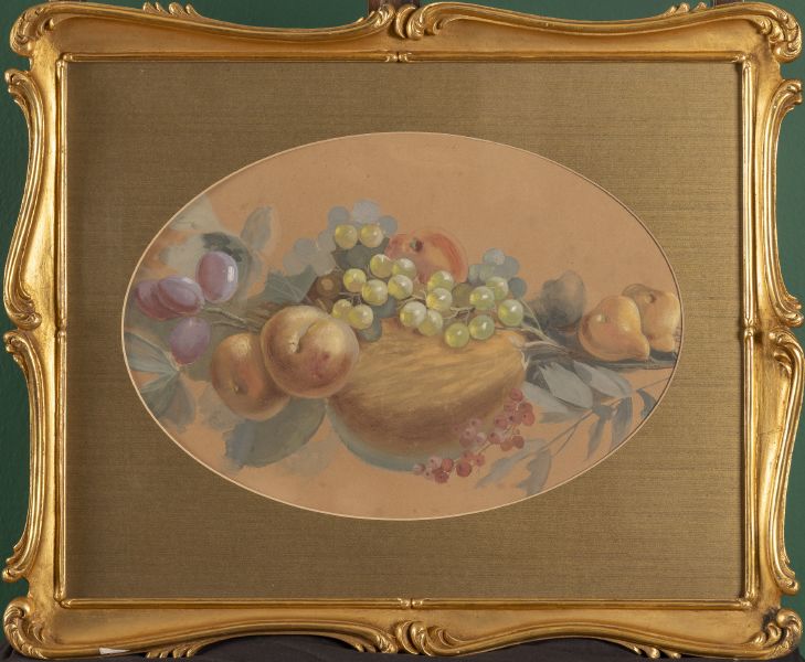 Zátiší s ovocem, kvaš/papír, na zadní straně popsáno s proveniencí galerie Karásek, sklo, pasparta, rám