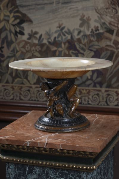 1. čtvrtina 20. století, Německo, bronzová noha s motivem muže na lvu, miska béžový mramor