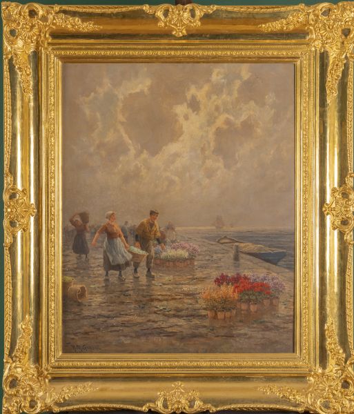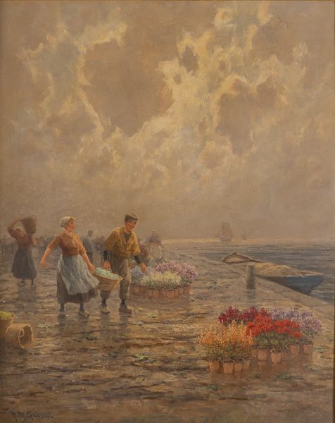 Květináři v přístavu kolem 1900, Holandsko?, olej/plátno, signováno vlevo dole H. M. Gabriel, rám