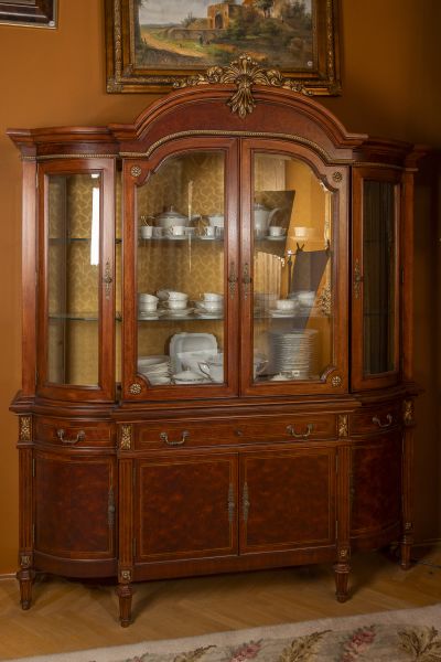 novodobé, dřevo, dýhované, zlacené řezby, ve spodní části skříňky, horní část prosklená