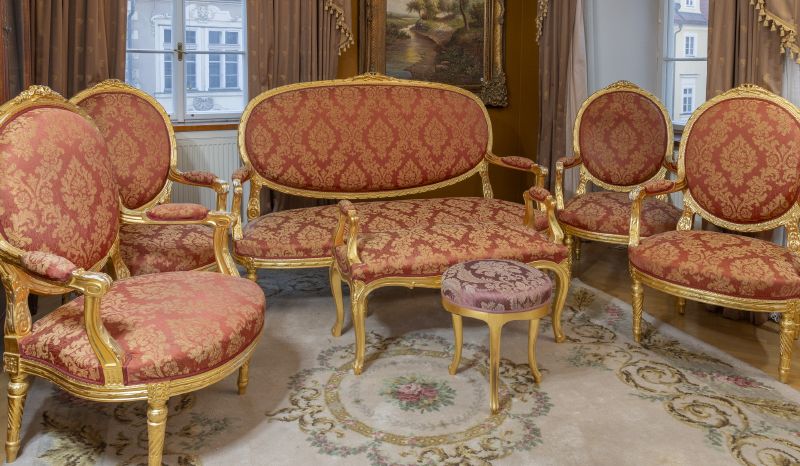 20. století, obsahuje: 6 křesel, sofa, čalouněná lavice, malá sedačka, dřevo řezané, zlacené, čalouněné sedáky i opěradla červeným brokátem, zlacení lehce poškozené, výška křesla 120 cm, sofa 124 × 185 × 70 cm, podélná lavice délka 100 cm