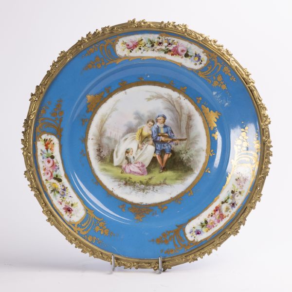 19. století, Francie?, porcelán, světle modrý fond, zlacená kartuše s pestře malovaným výjevem galantního páru, mosazná montáž, nepravá značka Sevres