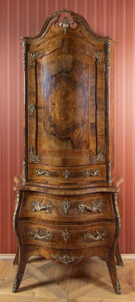konec 19. století, Drážďany, dřevo, výrazná ořechová dýha, čtyři krátké nohy, tři zásuvky, nad nimi skříň, výrazná vyklenutá římsa, intarzováno linkou, bronzové apliky