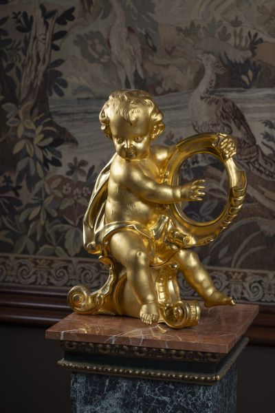 2. pol. 20. století, dřevo, řezané, zlacené, anděl sedící na volutě drží v ruce oválný rámeček na obraz, lehce poškozené zlacení