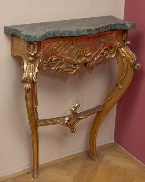 novodobé, dřevo, řezané, zlacené, dvě spojené esovité nohy nesou profilovanou desku ze zeleného žilkovaného mramoru
