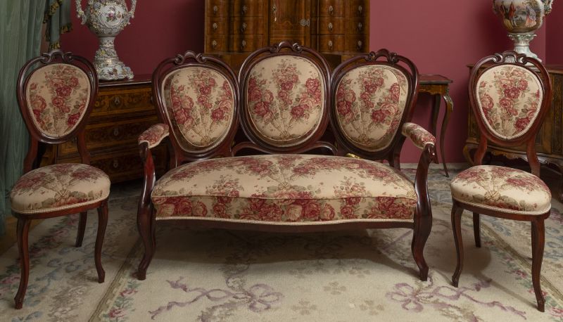 3. čtvrtina 19. století, Čechy, ořechové dřevo, řezané, mořené, obsahuje: sofa pro tři, šest židlí, čalouněné sedáky a opěradla potahem s tištěným květinovým vzorem výška židle 106 cm, sofa 110 × 150 × 90 cm
