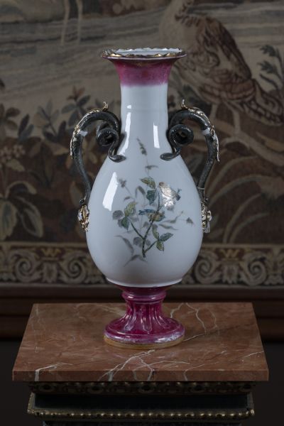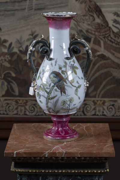 kolem 1900, Čechy, porcelán, baňatý tvar, esovitá ucha, pestře malovaná větévka s ptáčky