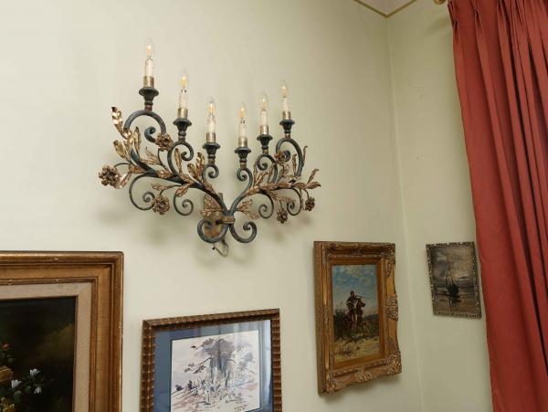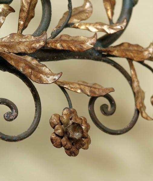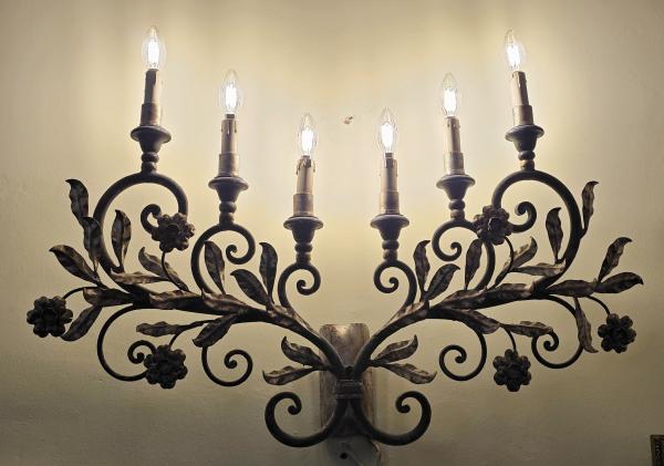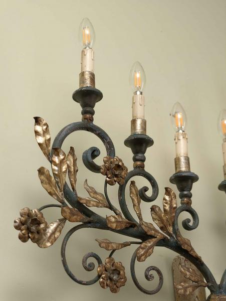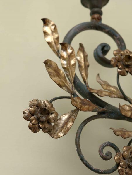 Reprezentativní nástěnné svítidlo s florálně komponovaným dekorem, vyrobené z kovu a výtvarně pojaté v duchu dekorativního francouzského designu poloviny 20. století. Konstrukce je rozvedena do šesti ramen zakončených objímkami pro žárovky, přičemž jednotlivé části jsou organicky propojeny volutami, stylizovanými listy a květy. Celek vyniká vyváženou symetrií, kvalitním řemeslným zpracováním a výrazným dekorativním účinkem.