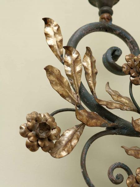 Povrchová úprava je ručně provedena a kombinuje tmavý základ s jemně akcentovanými zlatavými partiemi, které zdůrazňují plastické modelování florálních prvků. Svítidlo tak působí kultivovaně a hodnotně nejen ve dne, ale i při rozsvícení, kdy vytváří měkký a atmosférický světelný účinek.