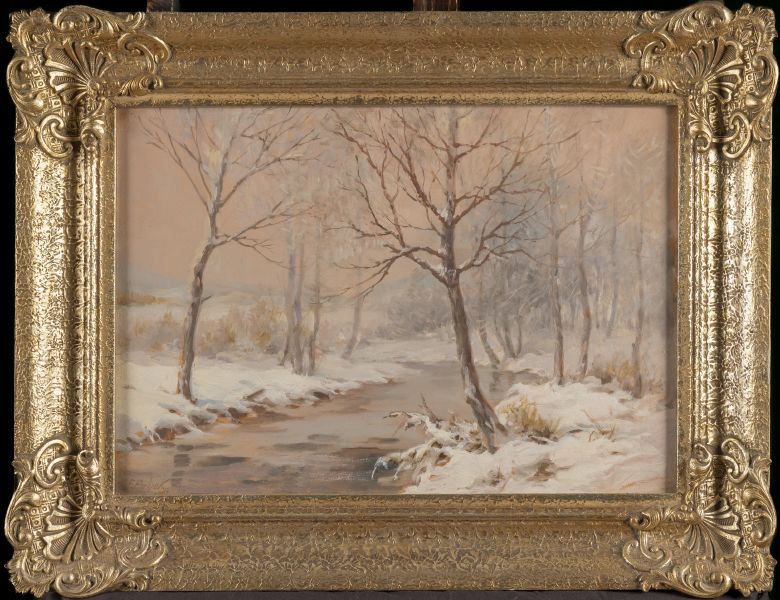 Zimní krajina s potokem, olej/karton, signováno vlevo dole F. Pařízek, sklo, rám