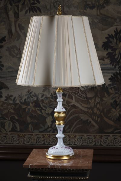 novodobé, porcelánová noha kombinovaná se zlaceným dřevem, látkové stínítko, elektrifikováno, bez záruky funkčnosti výška 90 cm