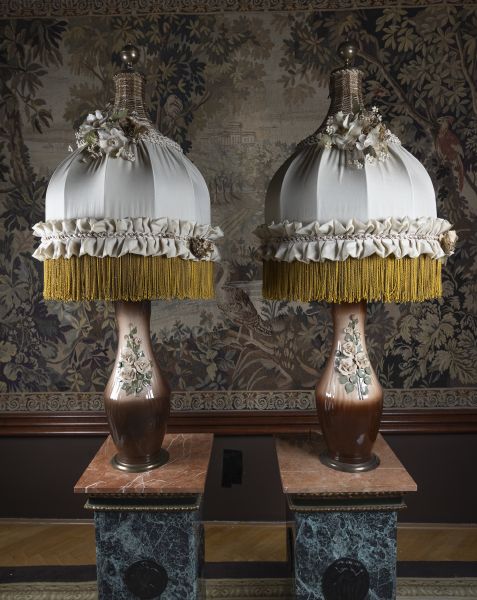 20. století, keramika, glazovaná, plastický motiv růží, látkové stínítko, elektrifikováno, bez záruky funkčnosti