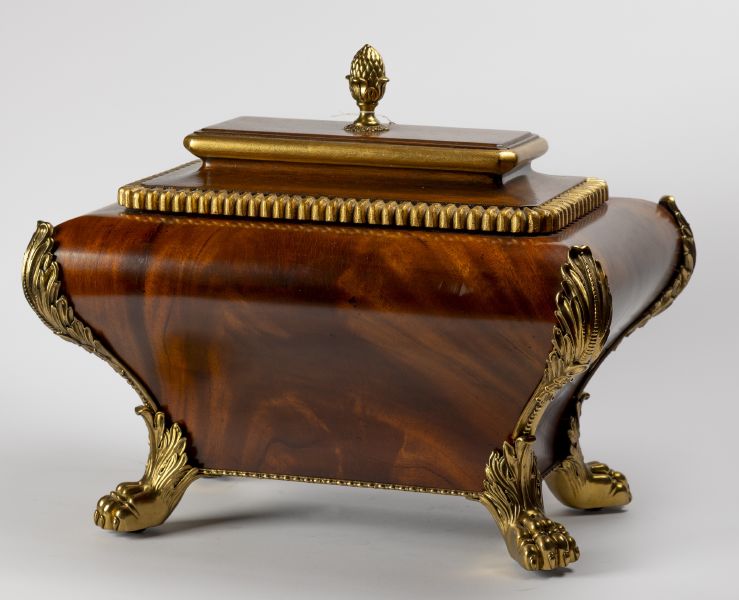 novodobé, mahagonové dřevo, řezané, zlacené bronzové nohy ve tvaru lvích tlap, odklopné víko