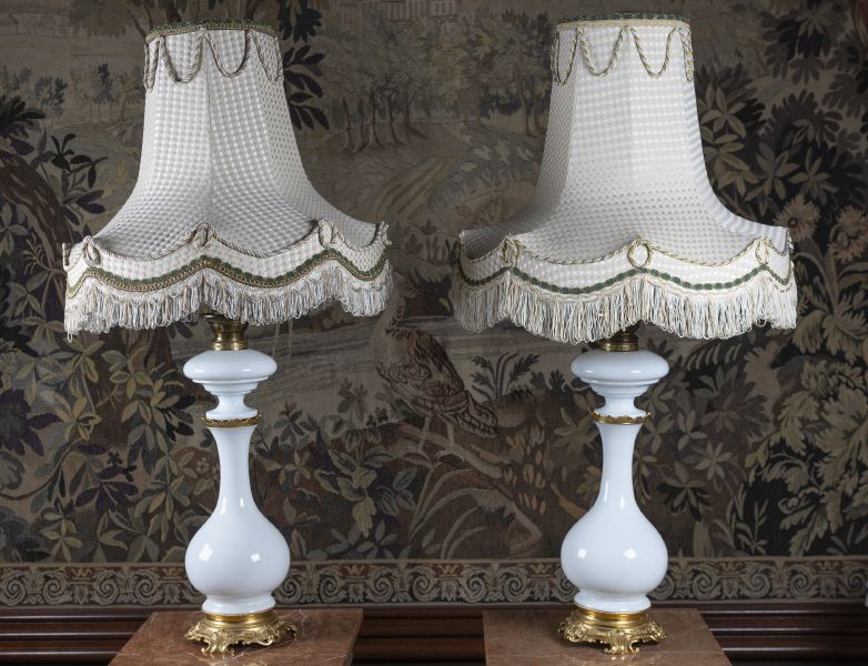konec 19. století, mléčné sklo, mosazná montáž v barokním stylu, původně petrolejové lampy, předěláno a elektrifikováno, látková stínítka, elektrifikováno, bez záruky funkčnosti