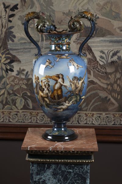s motivem zrození Venuše, 1. pol. 20. století, Itálie, keramika, pestře podglazurně malovaný motiv zrození Venuše, značeno, lehce poškozená horní ucha