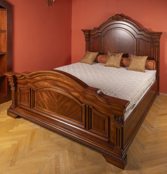 novodobé, dřevo, řezané, částečně dýhované mahagonem, po stranách řezané pilastry, vysoké čelo, celkové rozměry, velikost matrace 200 × 180 cm