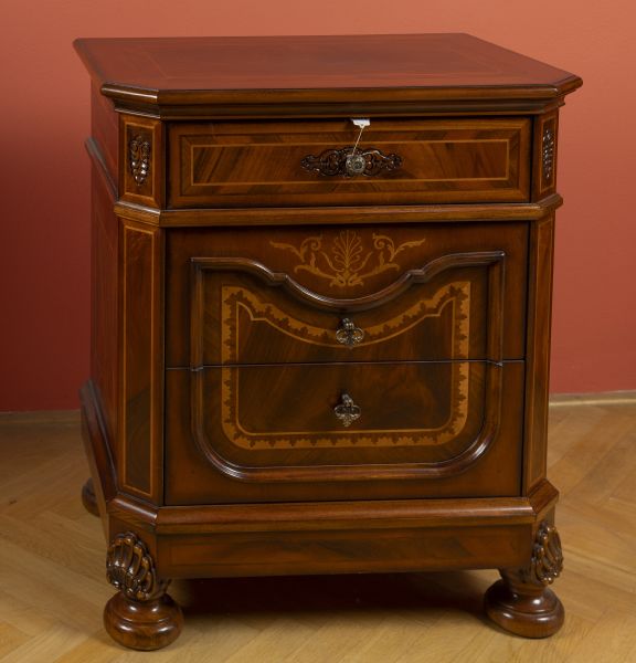 novodobé, dřevo, dýhováno exotickými dřevy, intarzováno, tři zásuvky