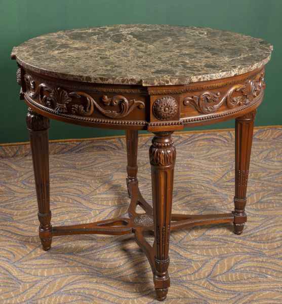 novodobé, dřevo, řezané, čtyři nohy spojené trnoží, lub stolu zdoben rozvilinami, deska z šedého žilkovaného mramoru