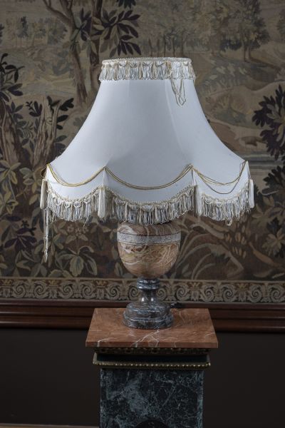 novodobé, noha ve tvaru vázy z různých mramorů, látkové stínítko, elektrifikováno, bez záruky funkčnosti