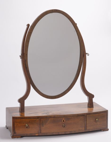 první polovina 20. století, dřevo, dýhované mahagonem, jemně intarzované, tři zásuvky, výklopné oválné zrcadlo
