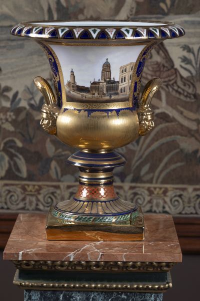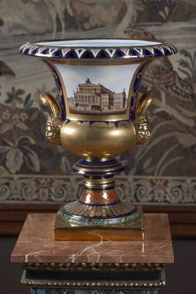 novodobé, porcelán, kobaltově modrý fond, bohatě zlaceno, obdélné medailony s pestře malovaným pohledem na divadlo, nepravá značka AR
