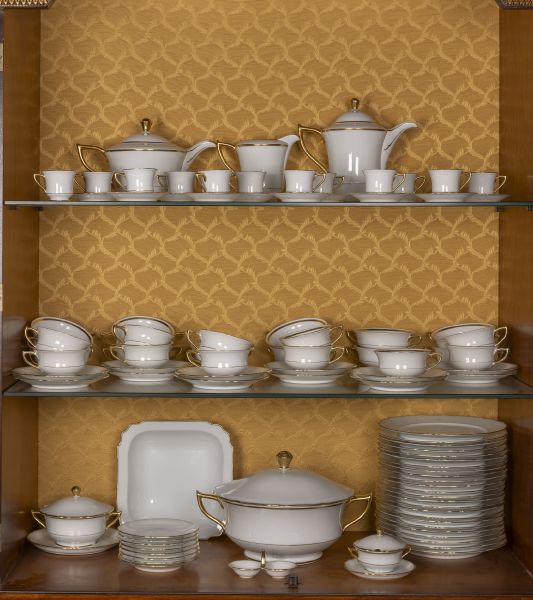2. čtvrtina 20. století, porcelán, zlacená linka, obsahuje: 24 mělkých talířů, 11 misek na bujón s talířky, polévková terina, čtvercová mísa, slánka, velký omáčník, malý omáčník, cukřenka, konvice na kávu, konvice na čaj, konvice na smetanu, 12 koflíků s miskami na kávu, jedna miska chybí, 11 koflíků s miskami na čaj, čtyři misky chybí, značeno Gloria Carlsbad