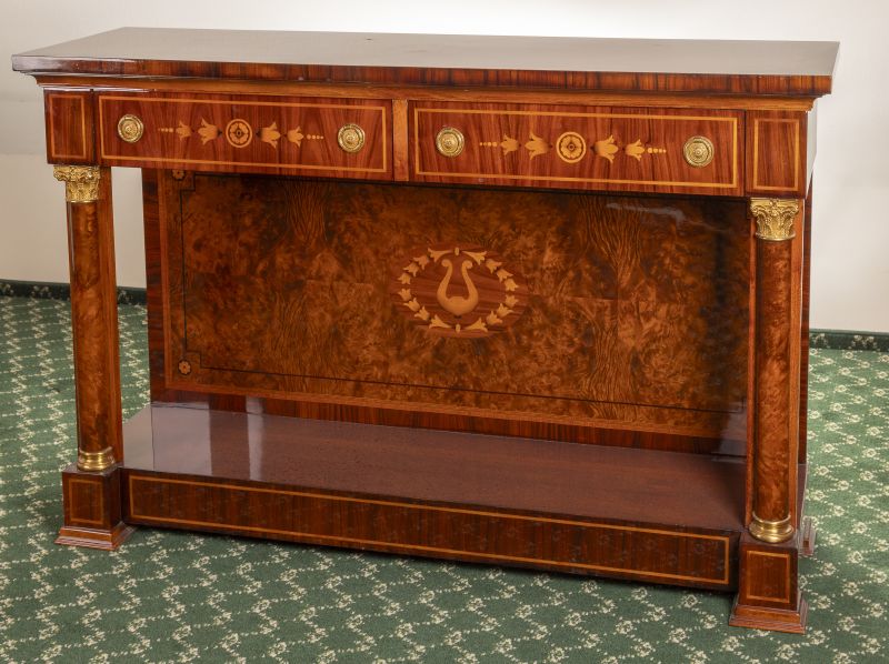 novodobé, dřevo, dýhováno mahagonem a kořenicí, intarzováno, po stranách polosloupky s bronzovými zlacenými hlavicemi, intarzované motivy zvonků a pásků, uprostřed intarzovaná lyra