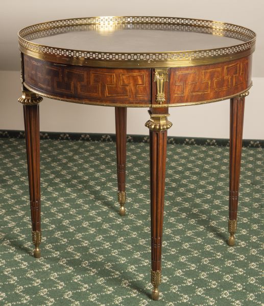 novodobé, dřevo, dýhováno exotickými dřevy, intarzovaný meandr, čtyři jehlancové nohy s bronzovými aplikami, kruhová deska z černého mramoru s mosazným rámováním, pod deskou zásuvka