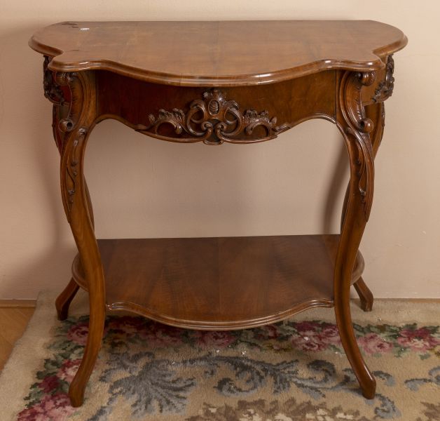 2. pol. 19. století, dřevo, ořechová dýha, čtyři esovité nohy dole spojené policí, pod profilovanou deskou zásuvka zdobená řezbou