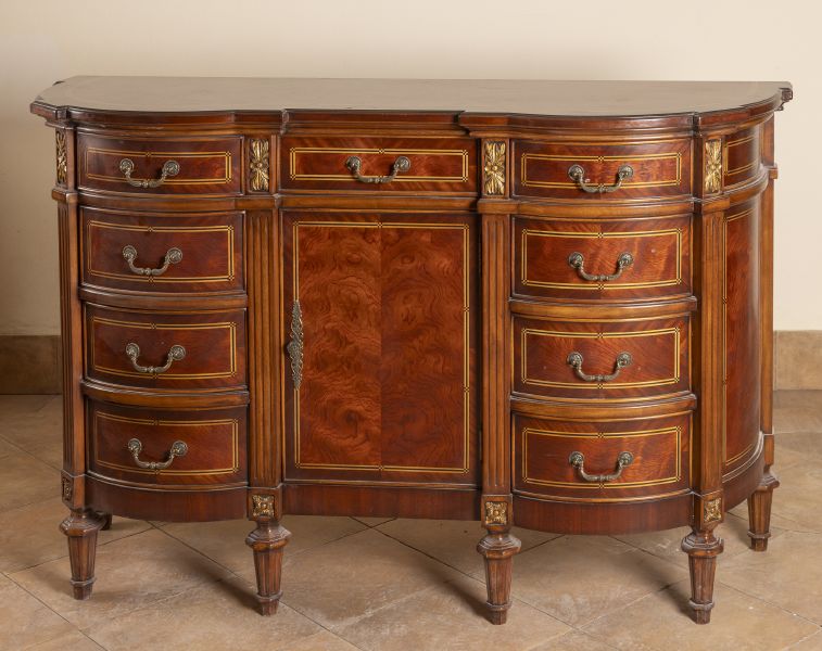 novodobé, dřevo, dýhováno exotickými dřevy, intarzovaná linka, po stranách zásuvky, uprostřed skříňka, profilovaná horní deska