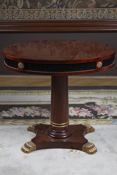 novodobé, dřevo, dýhováno, centrální noha na čtvercové základně s mosaznými patkami ve tvaru tlap nese oválnou desku s intarzovanou linkou