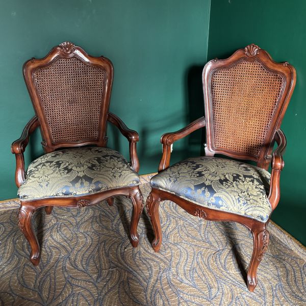 novodobé, ořechové dřevo, řezané, čtyři esovité nohy, sedák čalouněný modrým brokátem, opěradlo vyplétané pedigem