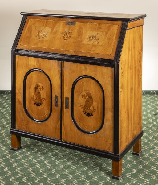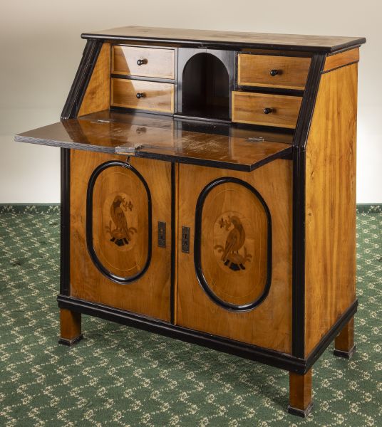 1. pol. 20. století, dřevo, ořechová dýha, intarzovaný motiv ptáčků, sklopná psací deska, uvnitř zásuvky, otřeno