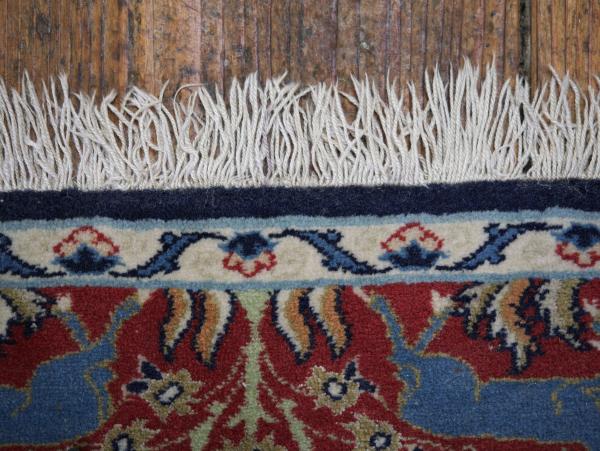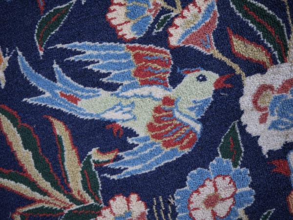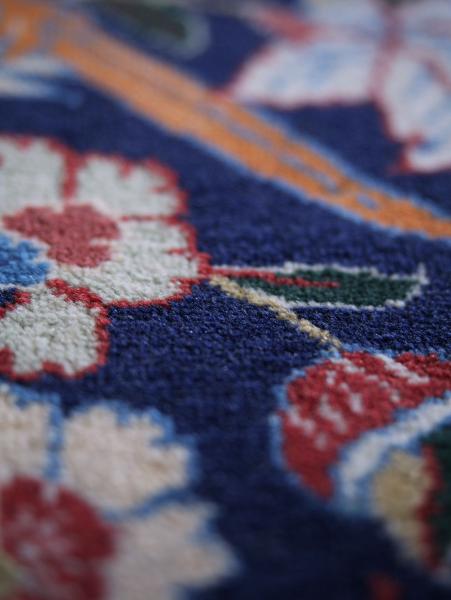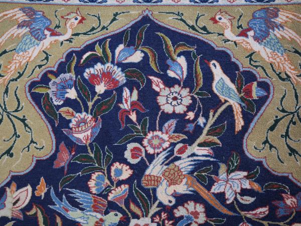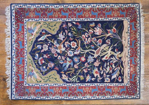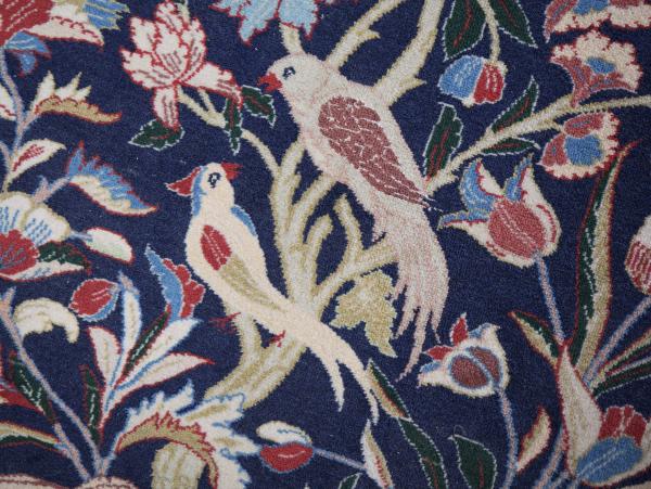 Jemný ručně vázaný perský kobereček z proslulého Isfahanu, vyhotovený z korkové vlny na hedvábné osnově. Vyniká mimořádně jemnou vazbou, precizním kreslením detailu a reprezentativní barevností v tónech tmavě modré, červené, světle modré, slonové kosti a zelené.