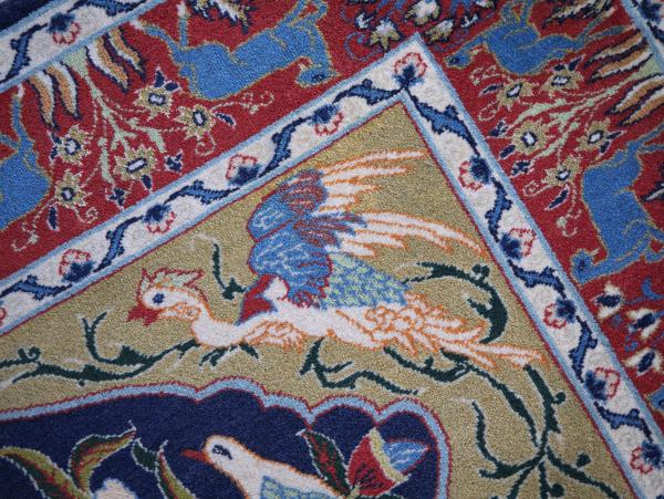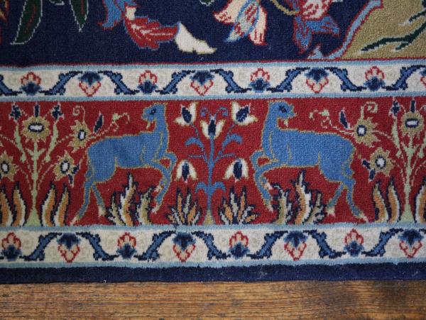 Středové pole zdobí působivý motiv stromu života s bohatě rozvětvenými květy a množstvím ptáků, který patří k tradičním a velmi oblíbeným perským kobercovým kompozicím. Ornamentika je doplněna dekorativní bordurou s figurálními a rostlinnými prvky, což celku dodává živost, eleganci a sběratelskou přitažlivost.