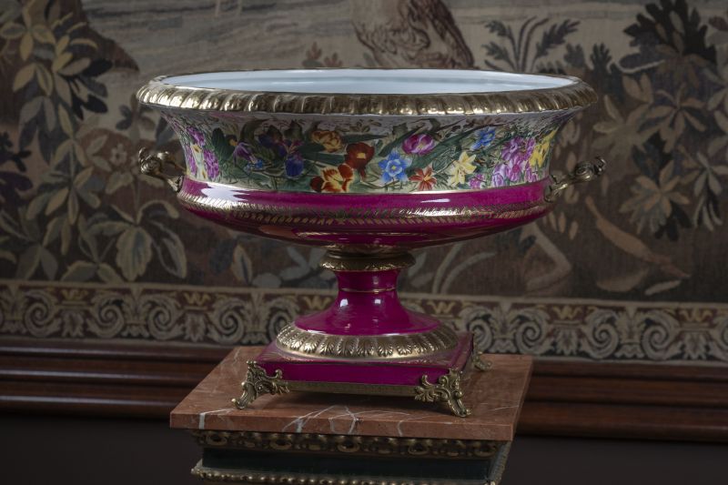 novodobé, porcelán, fialový fond, pestře malované květy, bronzová montáž, nepravá značka Sevres