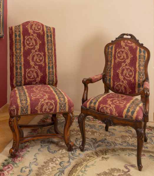 20. století, dřevo, řezané, čtyři esovité nohy spojené trnoží, celočalouněný sedák a opěradlo vínovým potahem