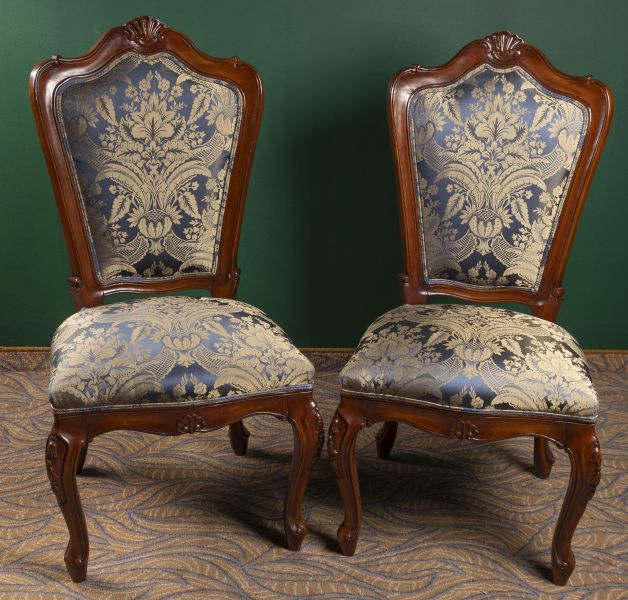 novodobé, dřevo řezané, čtyři esovité nohy, čalouněný sedák a opěradlo modrobílým brokátem