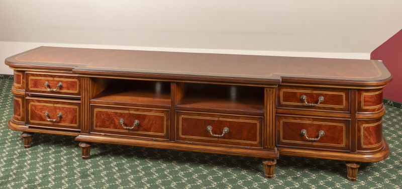 novodobé, dřevo, dýhováno exotickými dřevy a kořenicí, intarzovaná linka, v rozích řezané sloupky