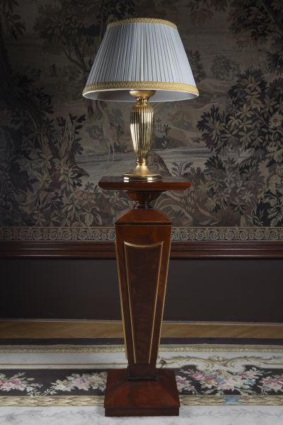 novodobé, dřevo, dýhované a částečně zlacené, lampa keramická, zlacená, látkové stínítko, elektrifikováno, bez záruky funkčnosti, výška sloupu 115 cm, výška lampy 70 cm
