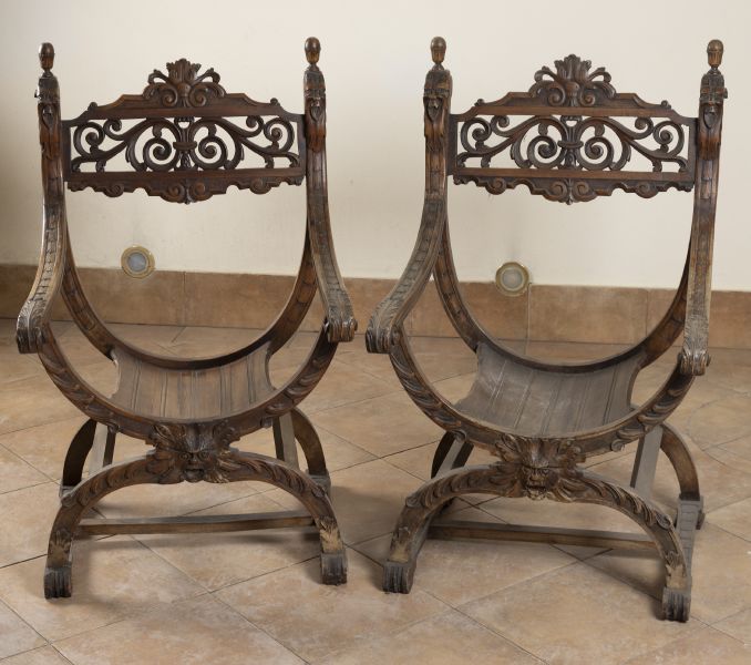 1. pol. 20. století, dřevo dubové, nůžkový tvar, řezané opěradlo, lehce poškozeno