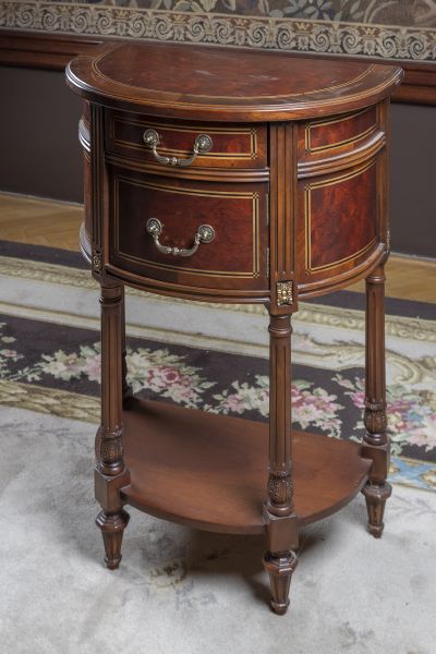 novodobé, dřevo, dýhováno exotickými dřevy, geometrická intarzie, čtyři zené nohy ve spodní části spojené trnoží, polokruhový tvar desky se zásuvko u a skřínkou, uvnitř zásuvky značeno Davon